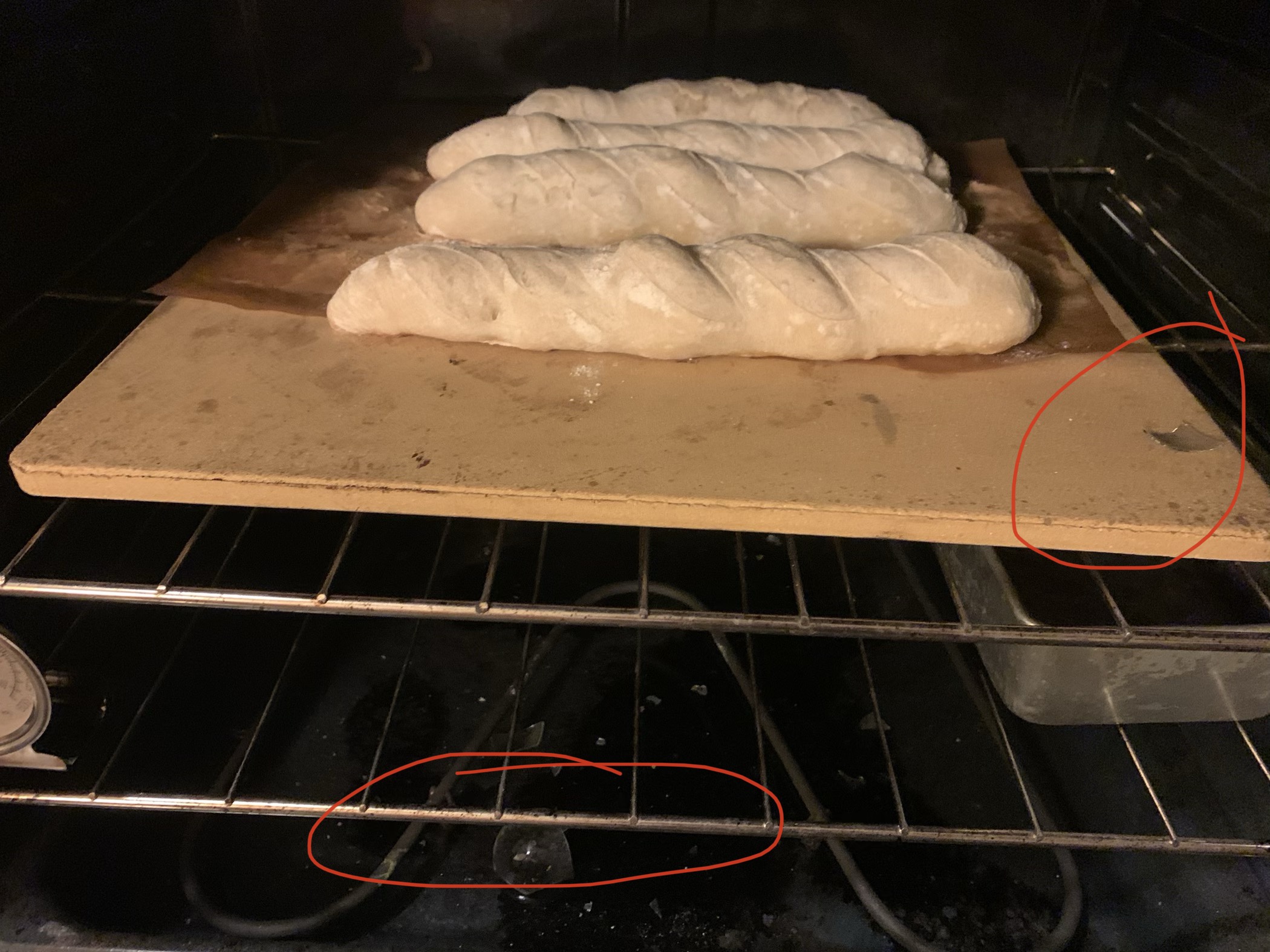 The foiled baguettes baked quite a bit from the residual heat. Regardless, glints of glass reflecting from the crust kept me from attempting any taste test.