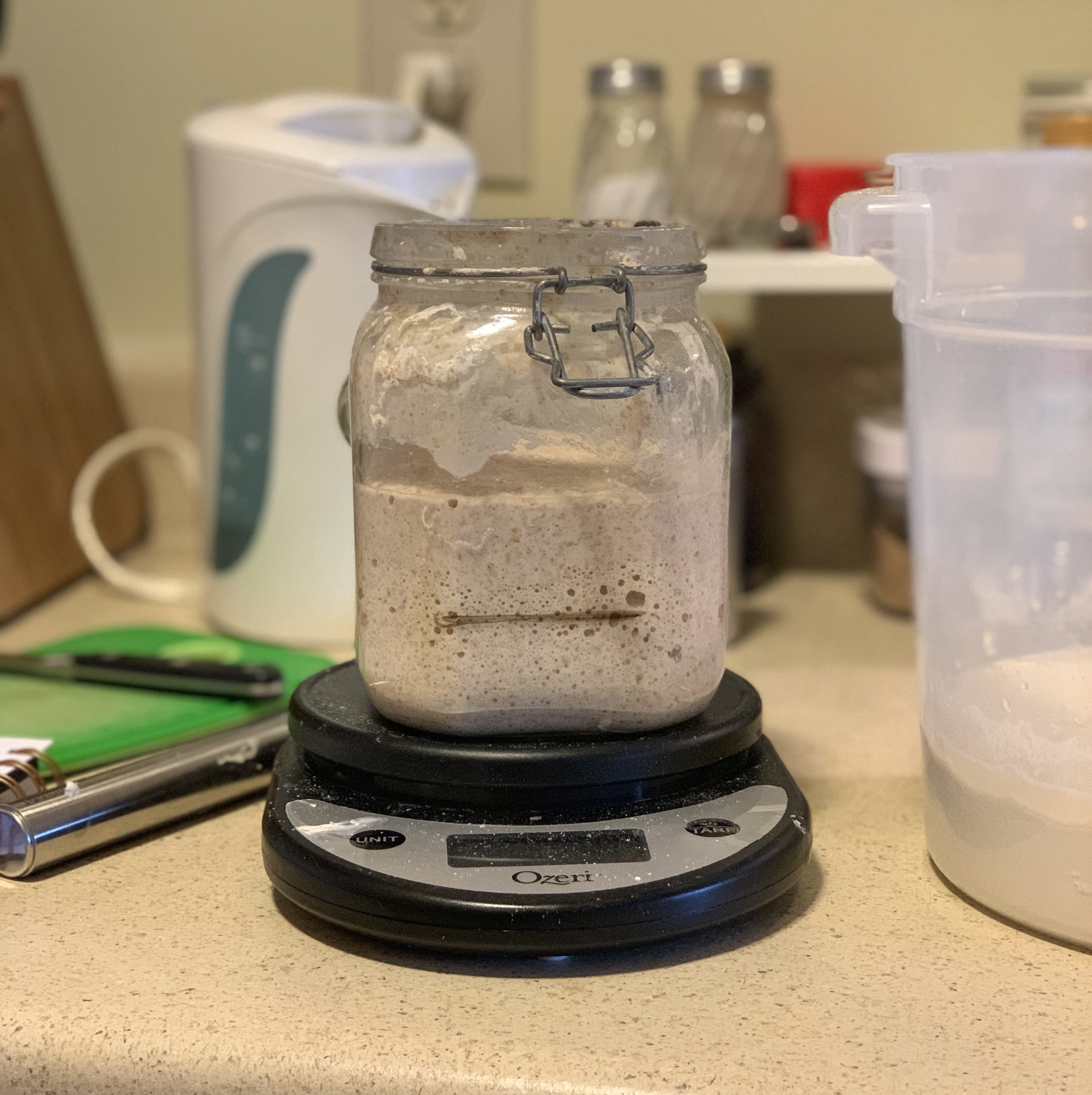 I needed a total of 300g starter for both recipes. The levain build in NWS always leaves lot of excess starter, and I didn’t want to have way too much left over, so I calculated just enough to leave a good amount to build on. I also wanted to counteract my soupy starter problem, so I fed Bradley with slightly less water than flour. I ended up using 50g mature starter + 160g AP/WW flour + 140g water.