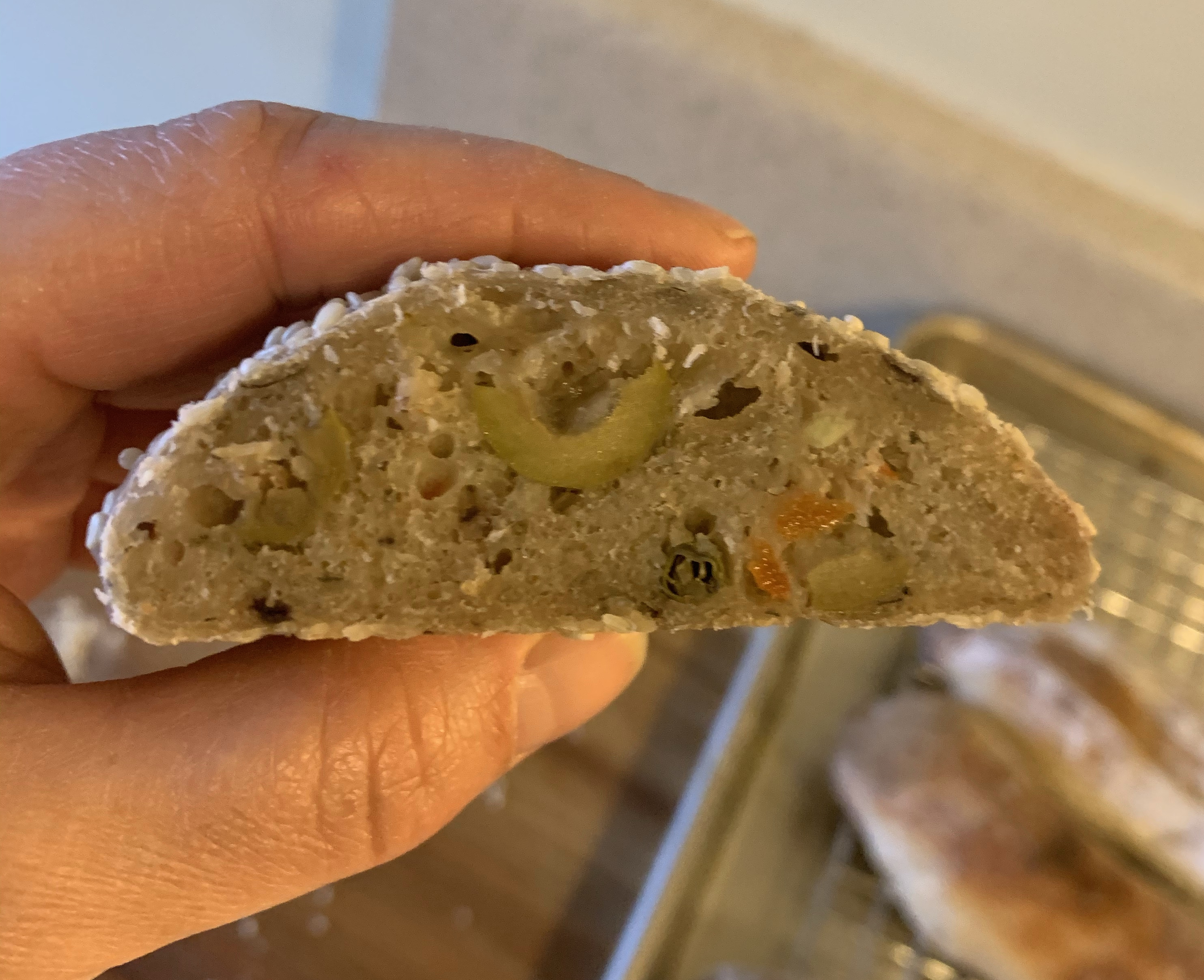 In another case of dashed confidence, my muffuletta rolls did not do well this time around. Instead of an airy crumb, the interior was dense and gummy. My research tells me they were under proofed; completely the result of my amateurish impatience.
